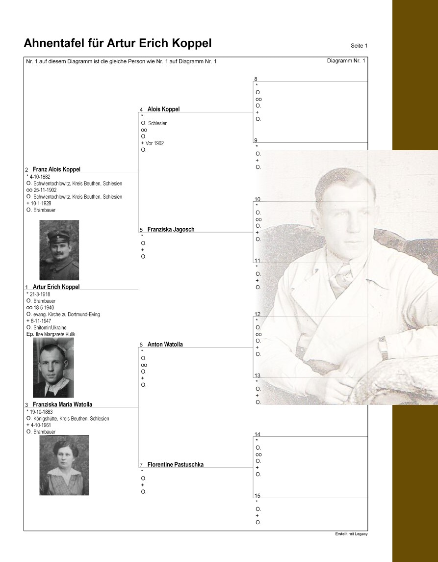 Die Eheleute Franz Alois KOPPEL (1882-1928, Eltern Alois KOPPEL und Franziska JAGOSCH) und Franziska Maria geb. WATOLLA (1883-1961, Eltern Anton WATOLLA und Florentine PASTUSCHKA) haben 1906 in Schwientochlowitz geheiratet und sind anschließend in das Ruhrgebiet nach Brambauer gezogen. Franz Alois Koppel hat dort auf der Zeche Achenbach gearbeitet. Sein Sohn Artur Erich Koppel (1918-1947) hat eine Bergmannslehre auf der Zeche Minister Stein in Dortmund-Eving absolviert. Er ist 1947 in sowjetischer Kriegsgefangenschaft verstorben.